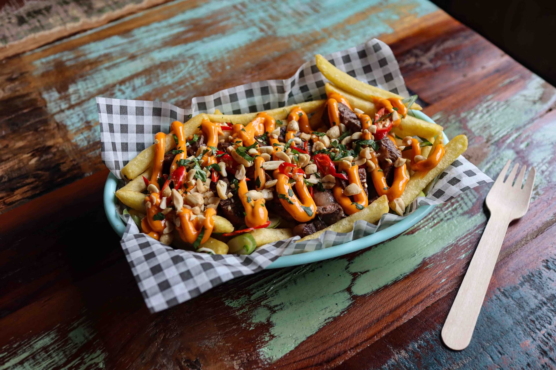 Styling and Props: Consider adding complementary props or background elements to enhance the visual appeal of your loaded fries. This could include rustic wooden boards, colourful napkins, or themed decorations that reflect the style or cuisine of your restaurant.